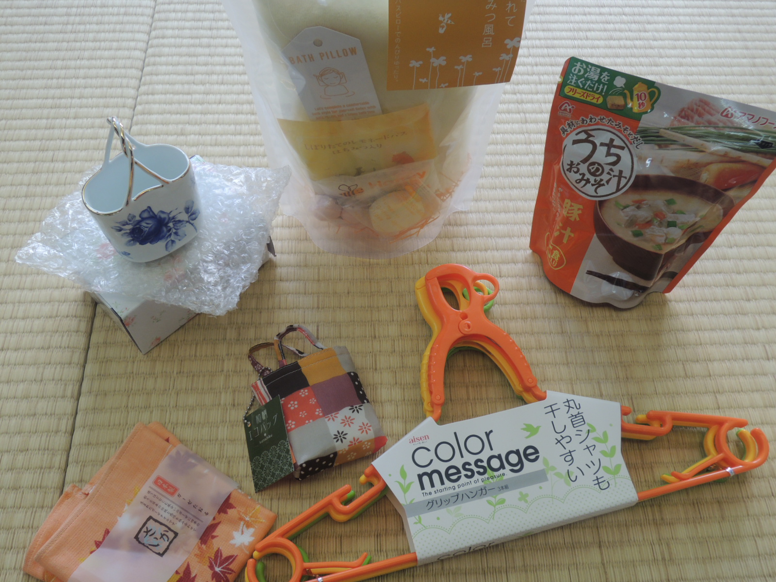 入浴剤セット、ガーゼタオル、即席味噌汁、エコバック、一輪挿し…
