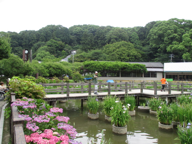 池に浮かぶ花菖蒲と一緒に。