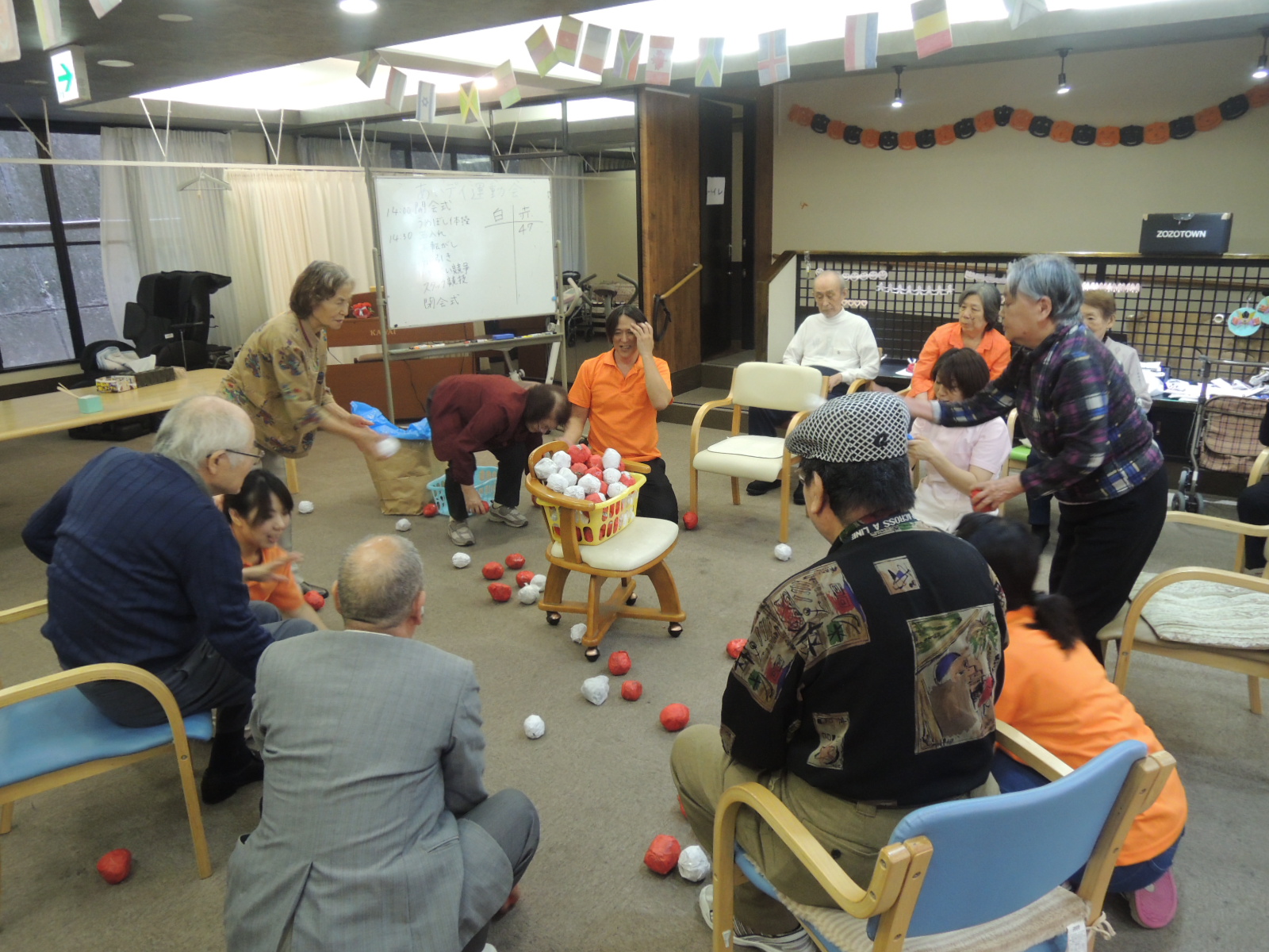 準備運動として、「梅干体操」の後、玉いれ・綱引き・パン食い・風船渡し・・・笑いありで大盛り上がり♪