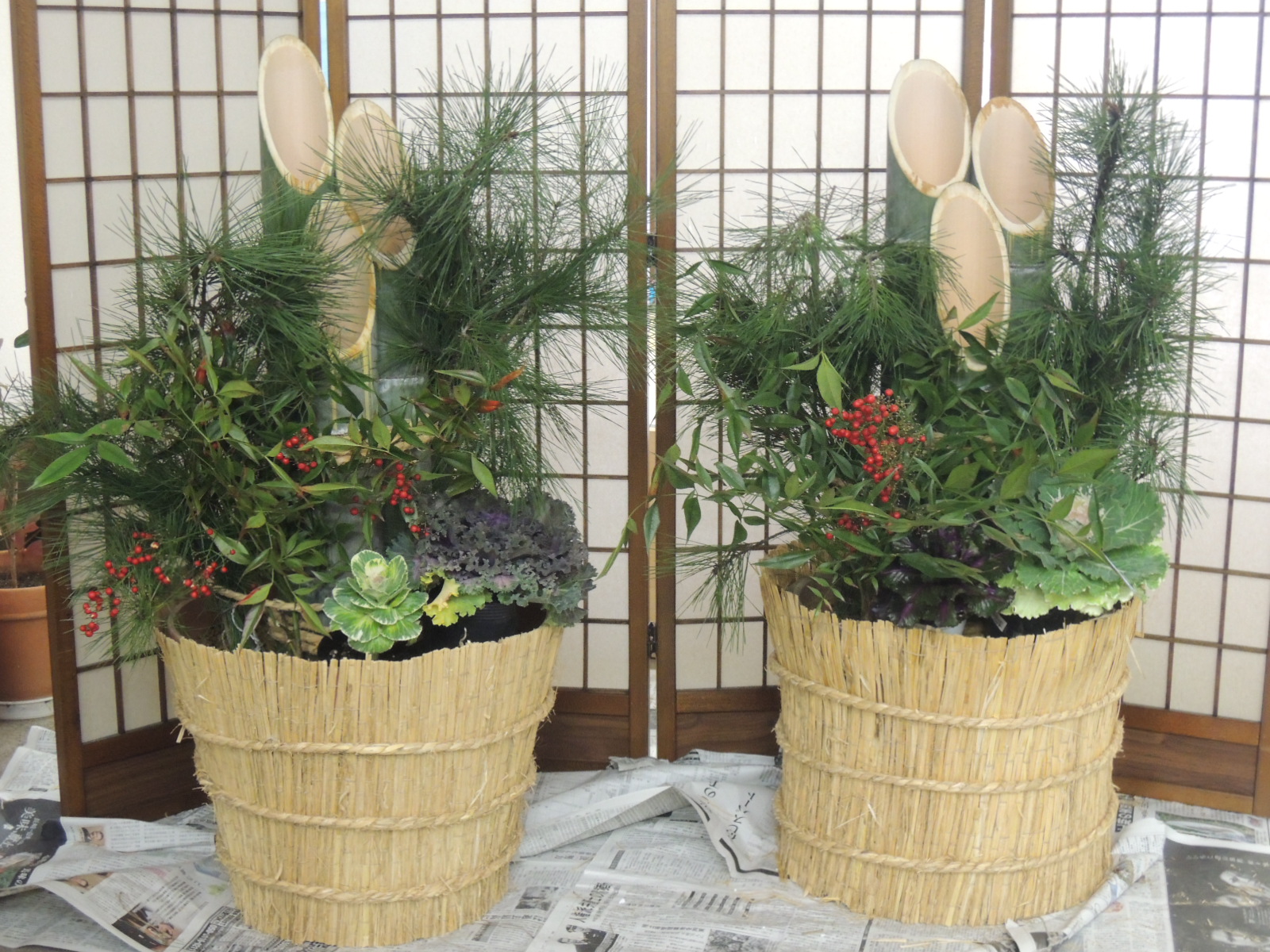 竹と松と南天をいただきました。葉牡丹、土、むしろを買い足し、早速作りました。「門松」