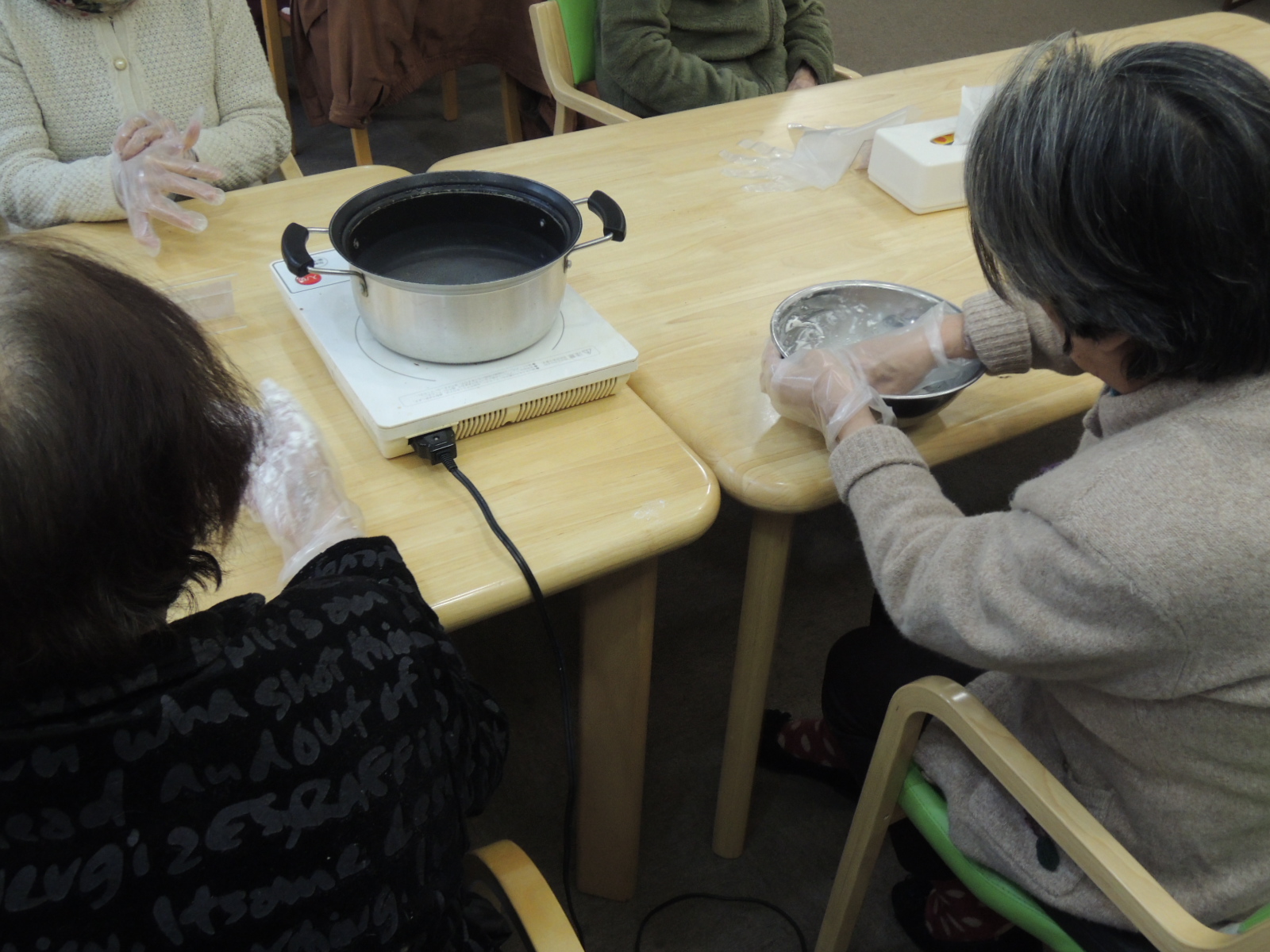 介護職員の稲葉浩志あっ、間違えた、原田二郎です! 今日のクッキングは、おしるこです!! おもちは危険性が高いので、うちでは白玉だんごを使います。