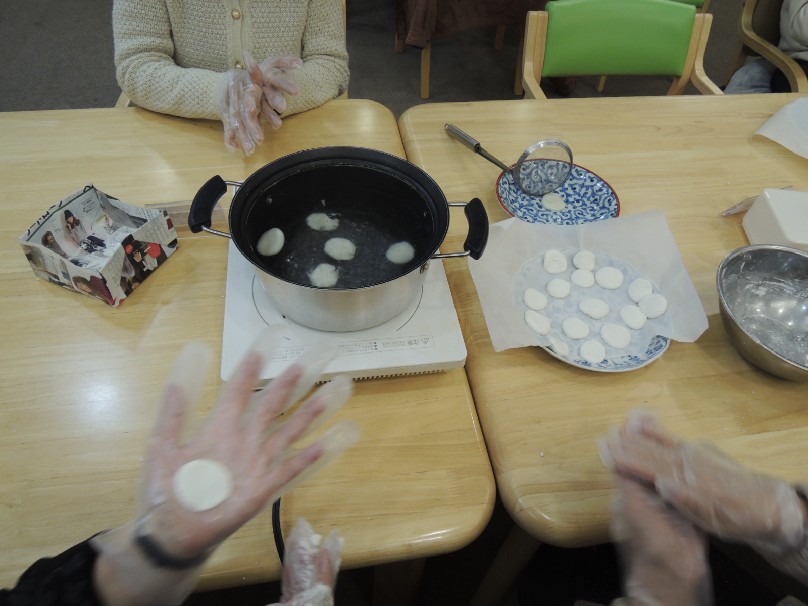 白玉粉をコネコネしていただいて、熱湯の中へ。浮かんできたらすくって、