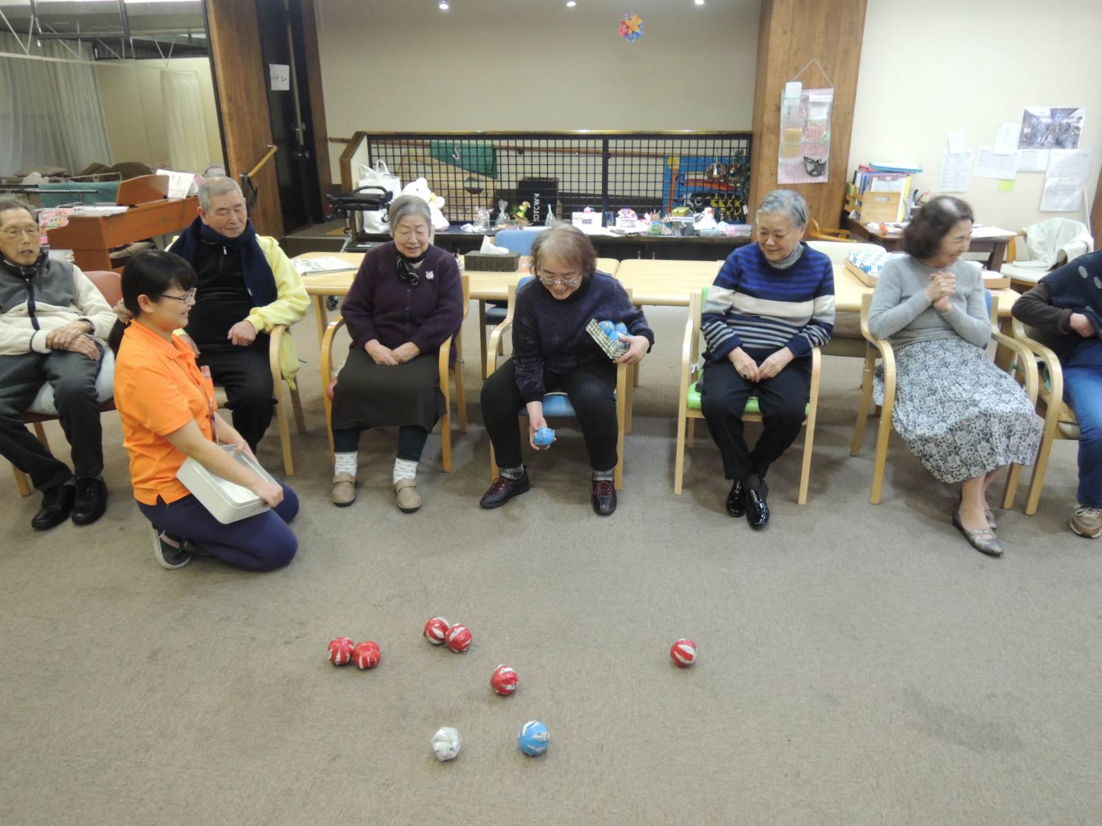あいデイサービスセンターでは新聞紙で作ったボールでゲームしています!